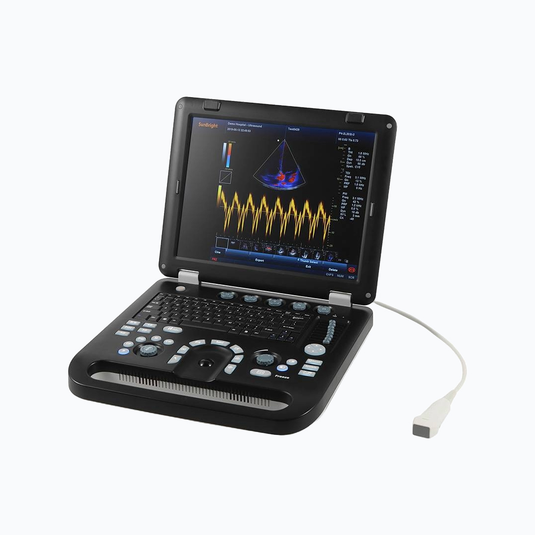 - 15-inch large LED color display with real Doppler function, USB ports, VGA port, and two probe connectors.