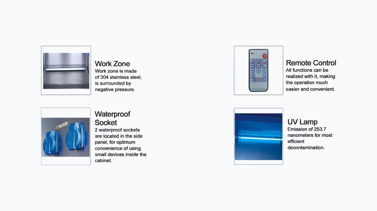 - Time Reserve Function: Saves up to 30 minutes of waiting time after activating the cabinet and the sterilization time after an experiment.
