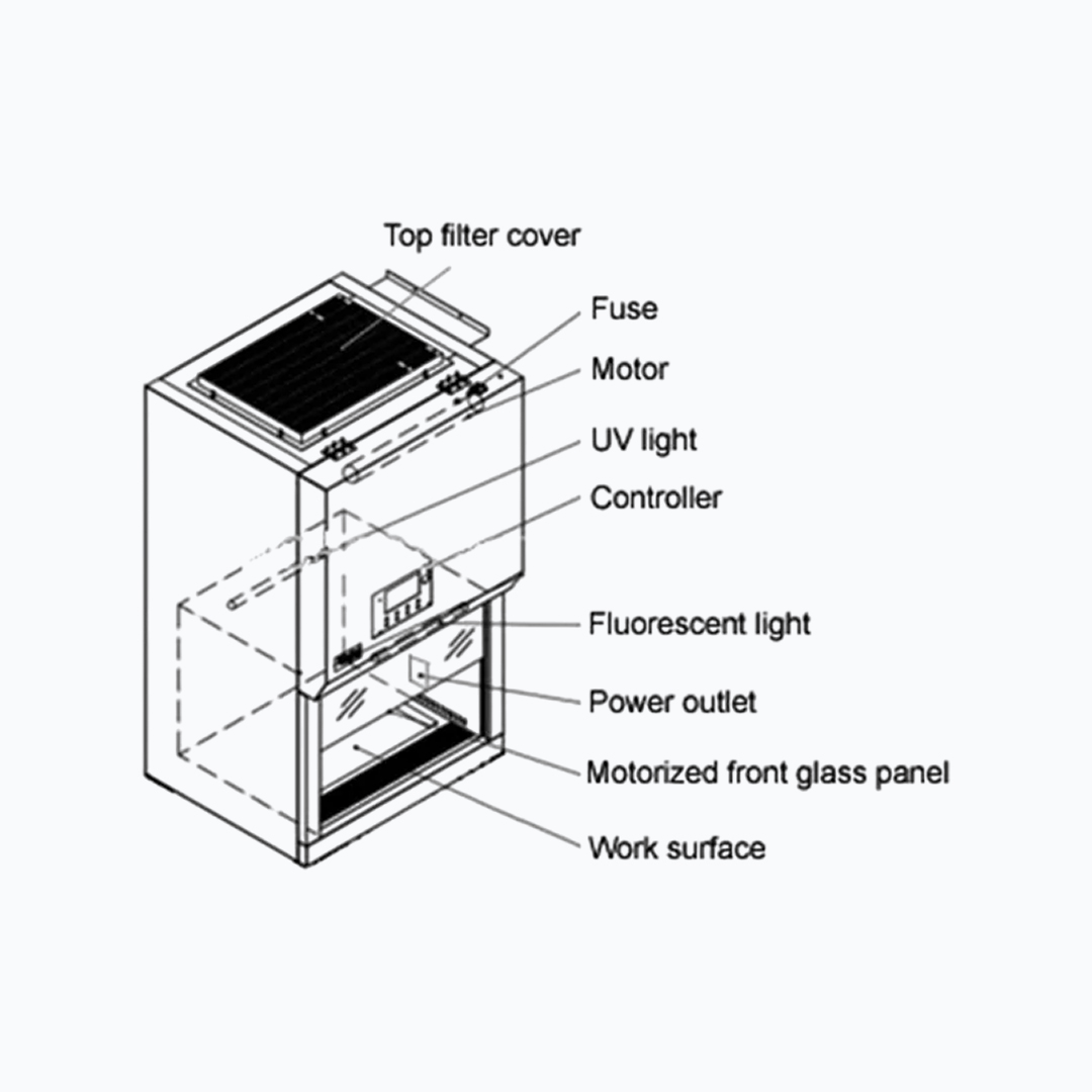 - Large LCD Display: Provides detailed cabinet status, including inflow and downflow velocity, work area temperature and humidity, filter pressure, UV working time, filter life, and more.