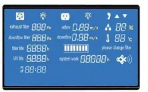 | Visual and Audio Alarm | Filter replacement, window over height, abnormal airflow velocity, high filter pressure alarm |