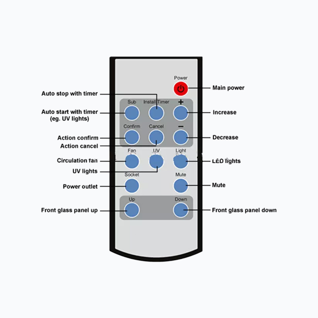 - Interlock Function: Ensures safety with interlocks between the UV lamp and front window, UV lamp and blower, LED lamp, blower, and front window.